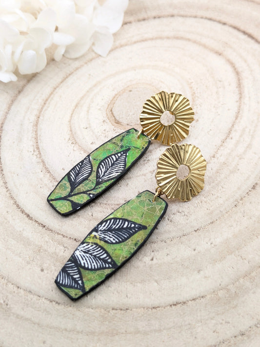 Boucles d'oreilles longues, vertes et fleuries