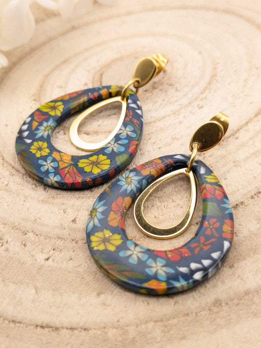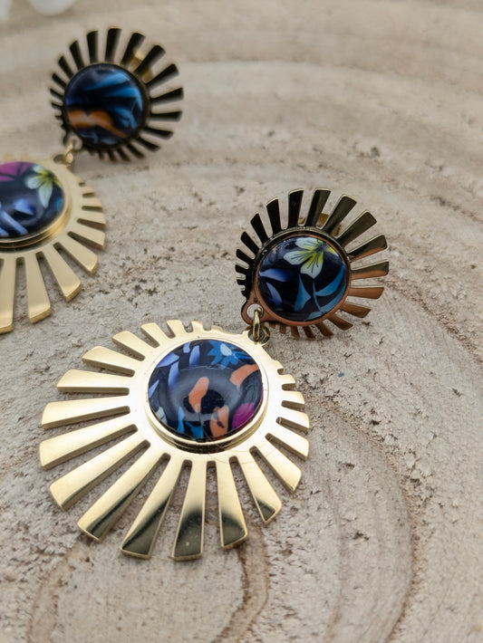 Boucles d'oreilles fleuries sur fond bleu foncé