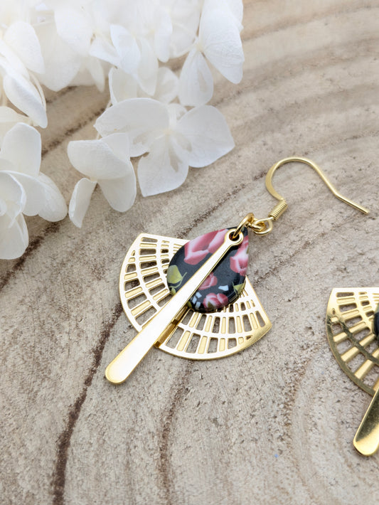 Boucles d'oreilles fleuries sur fond noir "rose"